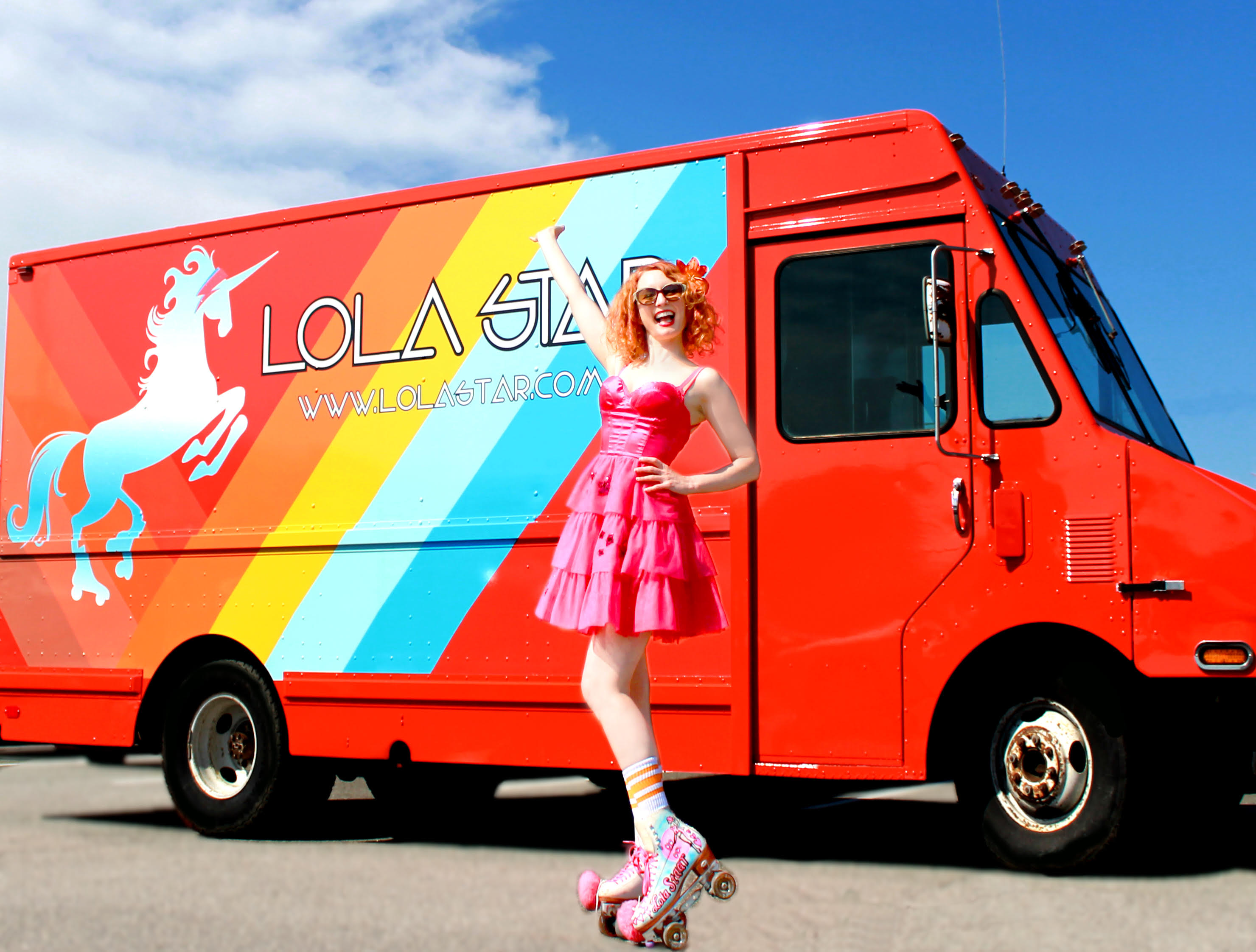 This dazzling roller disco party mobile is adorned with Lolas custom designed glitter unicorn roller skating over a rainbow with a David Bowie inspired lightning bolt eye printed in glitter vinyl. The truck will contain rental skates for guests to use upon her portable roller disco floor capable of being assembled anywhere! The roller disco possibilities are endless and taking possibilities to their fabulous extreme is what Lola Star is known for. Be there!!