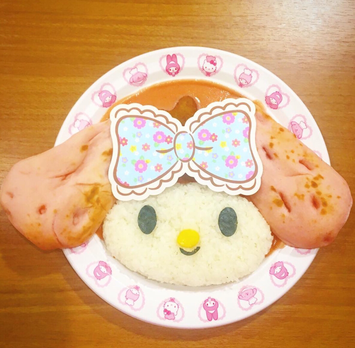 Lunch at the Hello Kitty Amusement Park!!!! Pink curry “My Melody” with a rice face, pink nan ears, nori eyes & star samosa-esque thing hidden under the bow as an extra surprise!! OMG!!!! ???