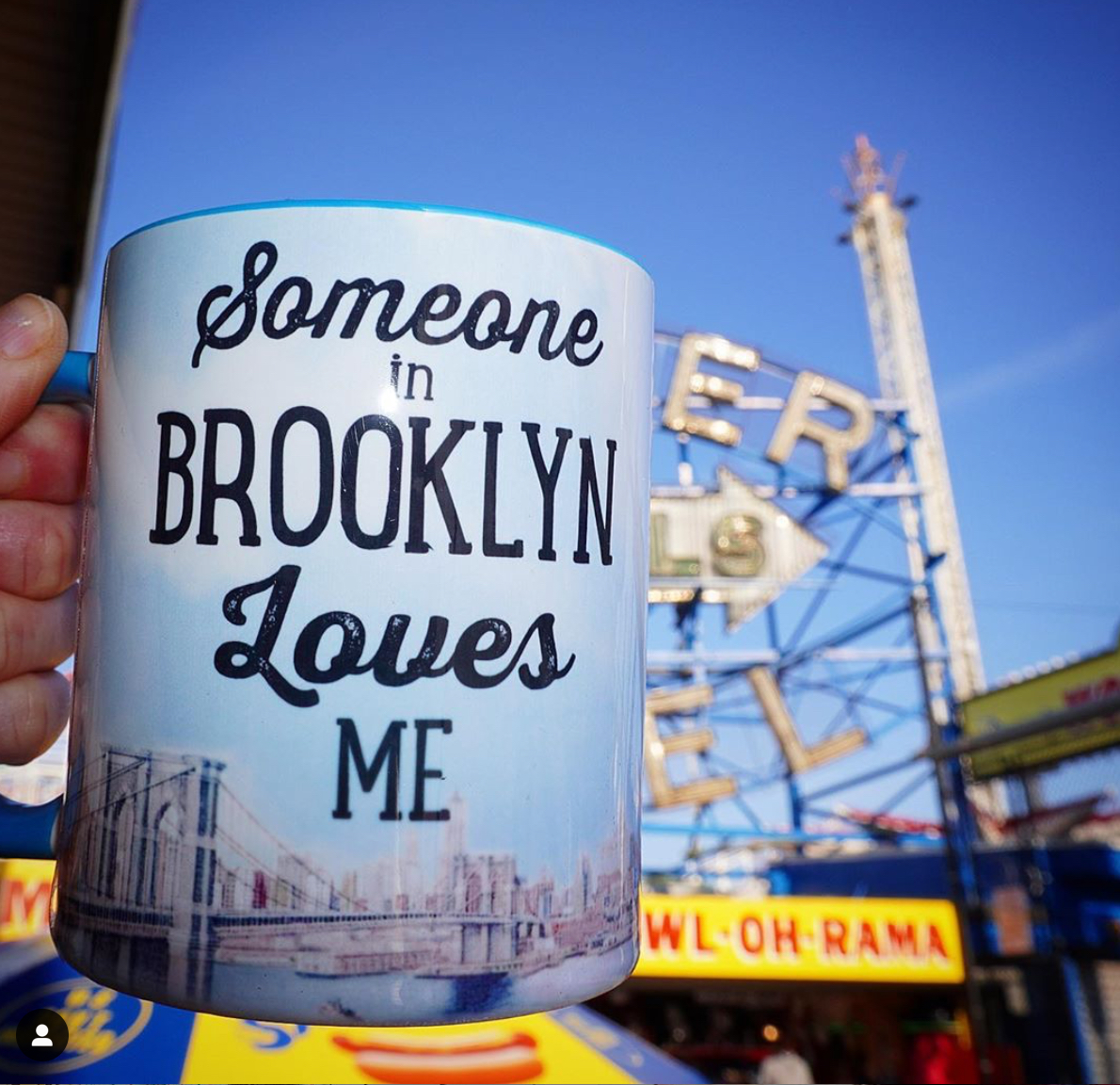 Send your loved ones special tokens of your love like this Someone in Brooklyn loves me coffee mug designed by Lola Star and hand printed at Industry City Every time they drink from this mug they will FEEL a warm hug from you!