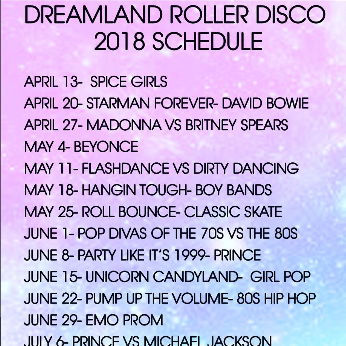 Summer is winding downnnn but disco is heating up!!! Our roller disco season at runs through the middle October! Check out the rest of our fab schedule of parties!! Tickets available at www.dreamlandrollerrink.com! Aug 18 Wannabe- spice girls Aug 25 Purple Rain- Prince Sept 1……